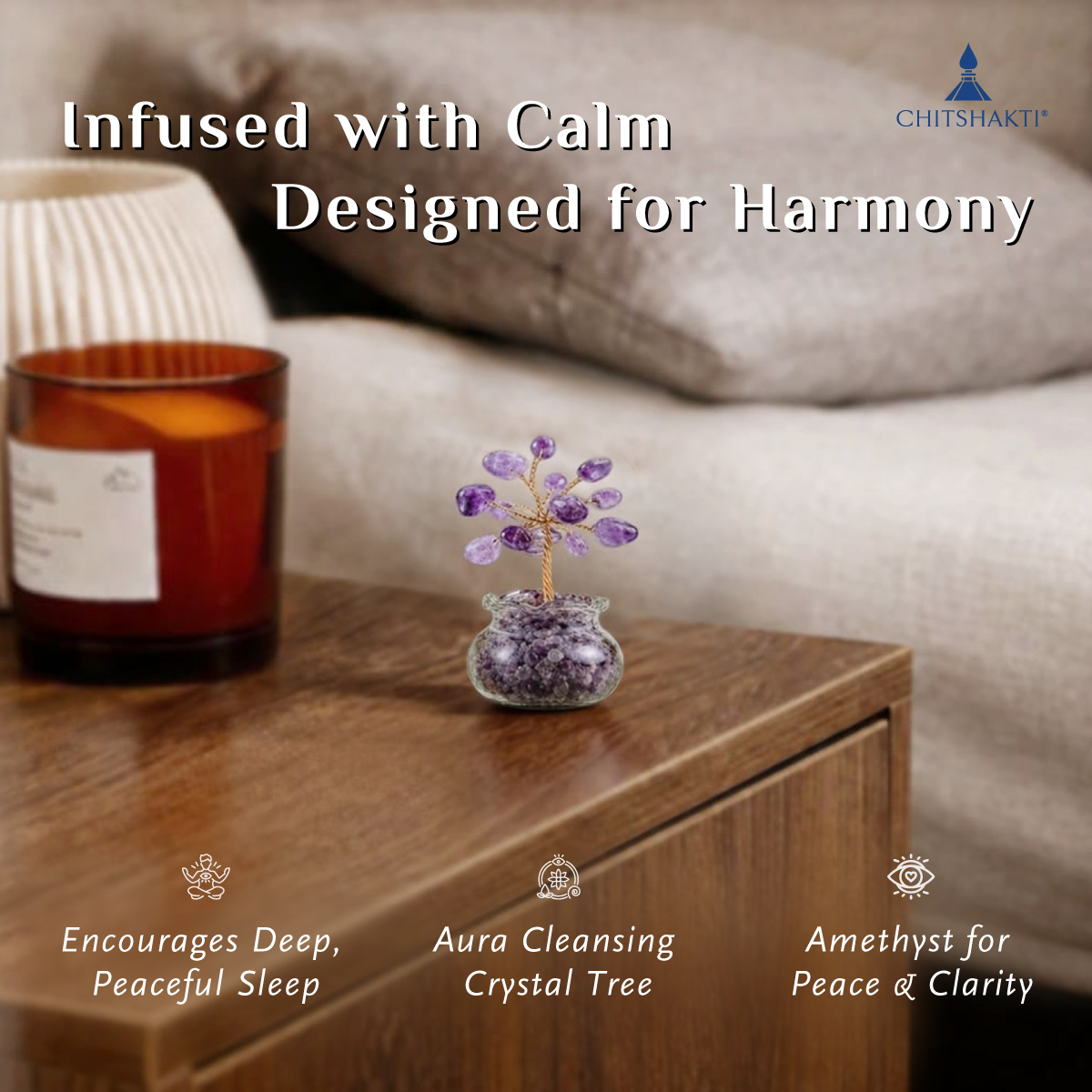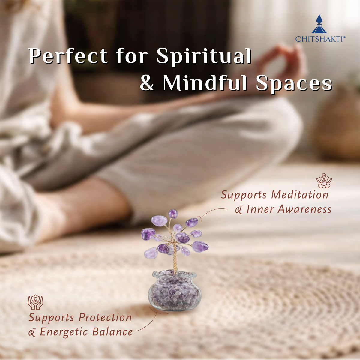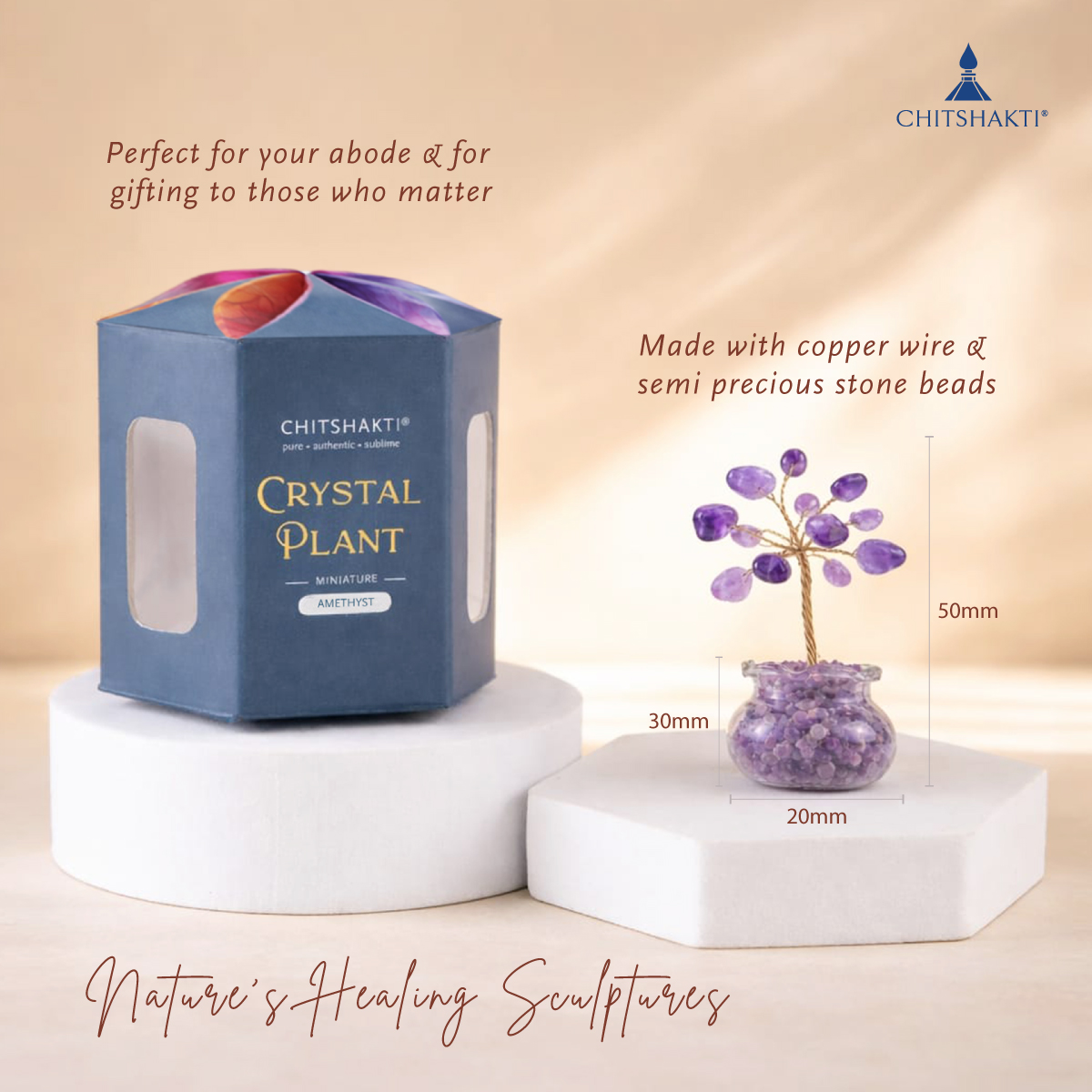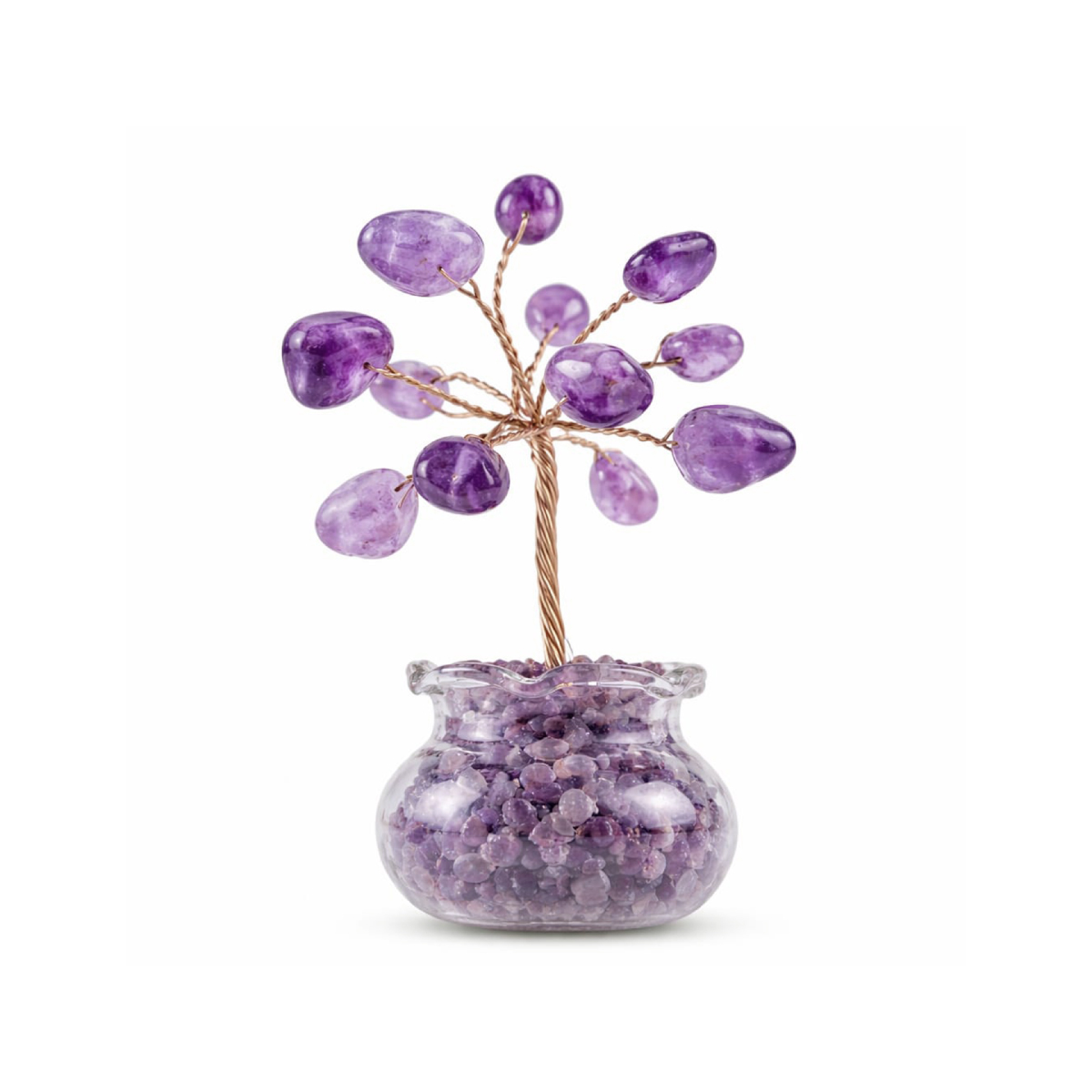 This miniature crystal plant adds beauty and calm to any space. At the same time, it offers a soft and elegant look. It features delicate amethyst stone beads placed on fine copper wire; therefore, it appears refined and detailed.