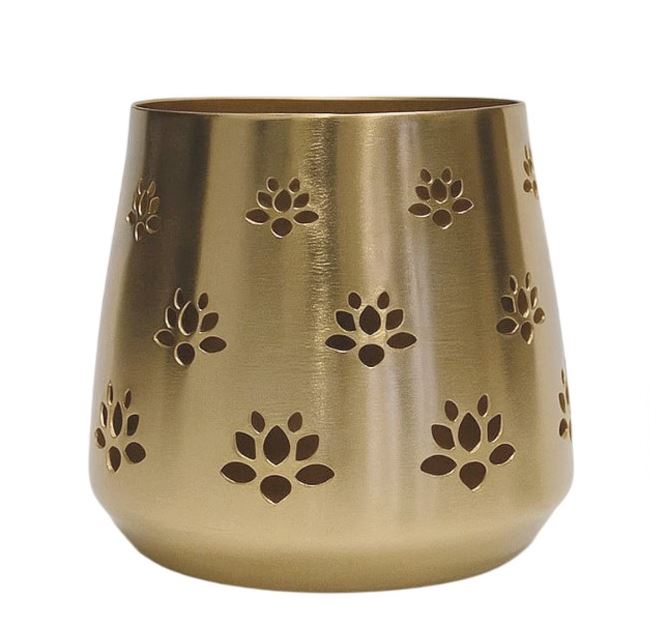 Elegant antique gold votives with lotus designs. Available in two styles, they cast a soft, calming glow and bring peace, beauty, and devotion to any space.