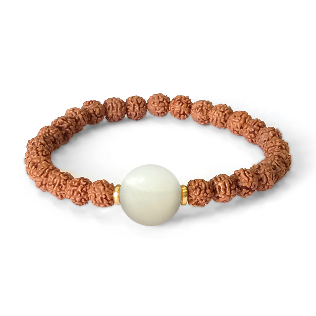 This beautifully made bracelet has authentic panchmukhi rudraksha beads and finest quality Moonstone semi-precious stone.
