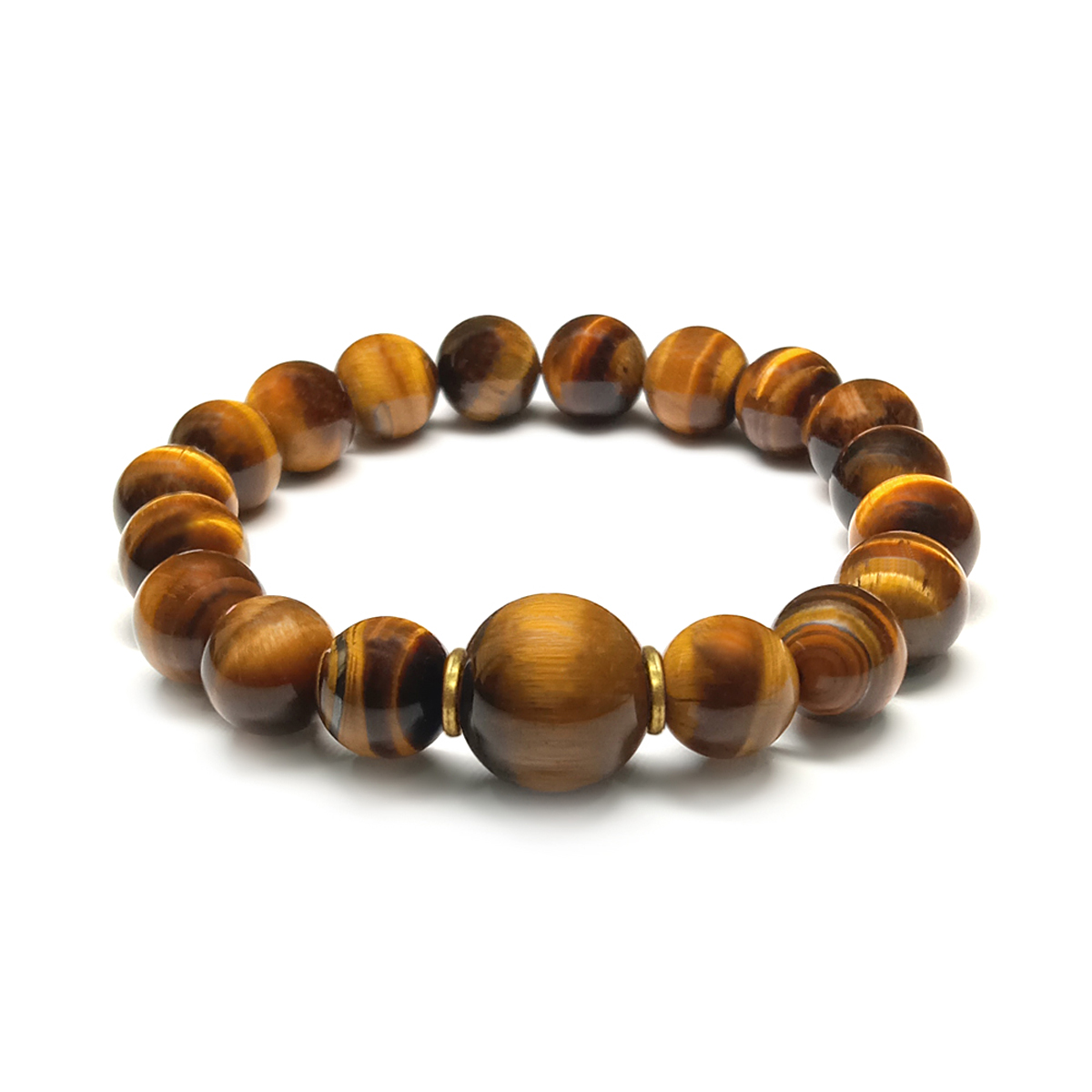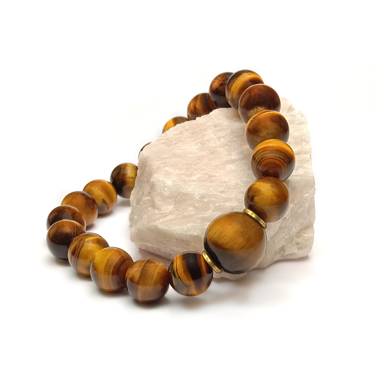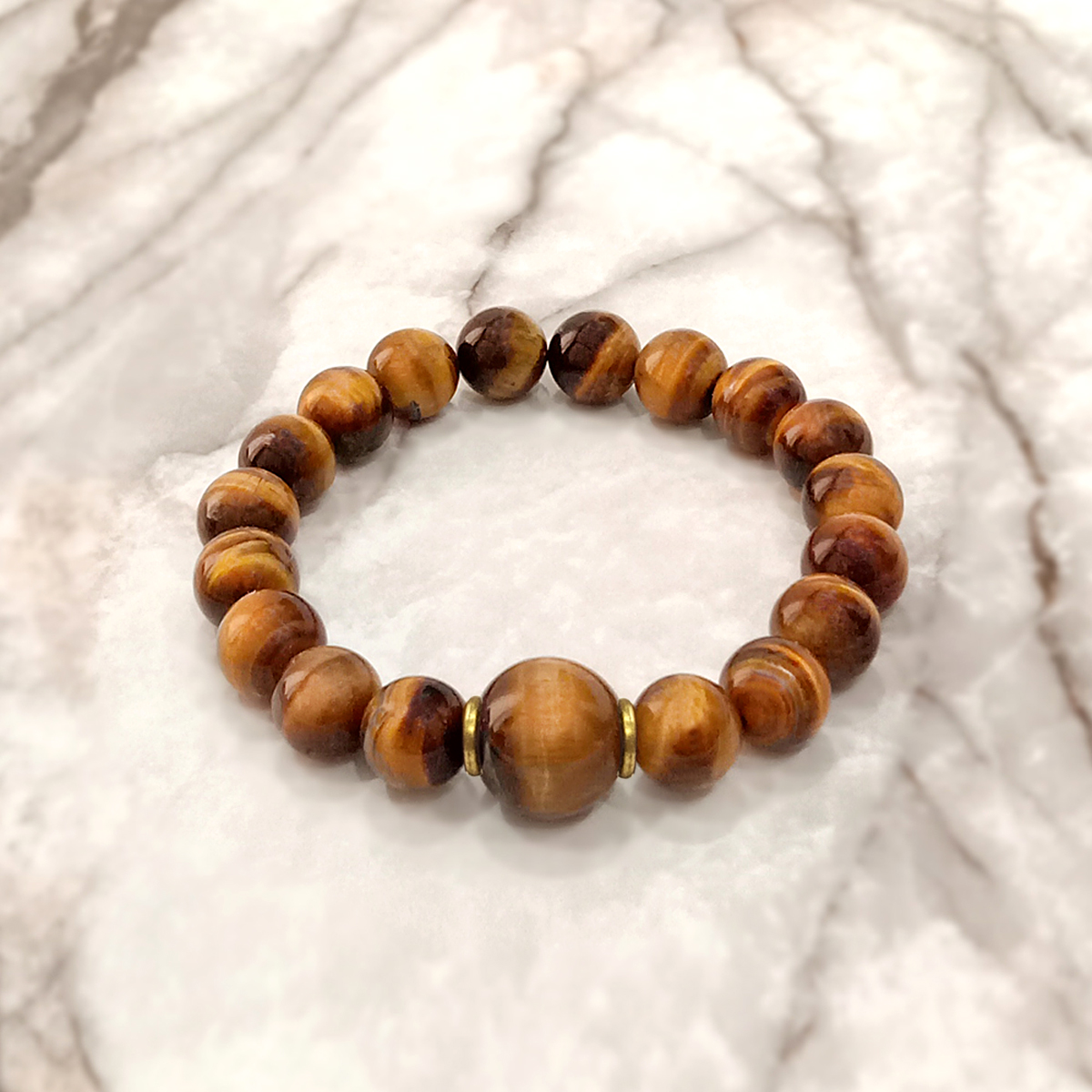 All malas feature polished tiger’s eye beads strung on an elastic cord with gold-colored spacers.